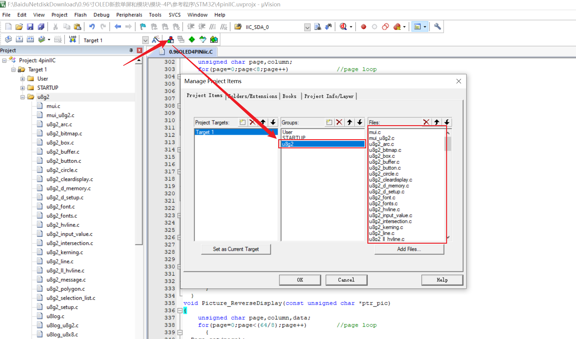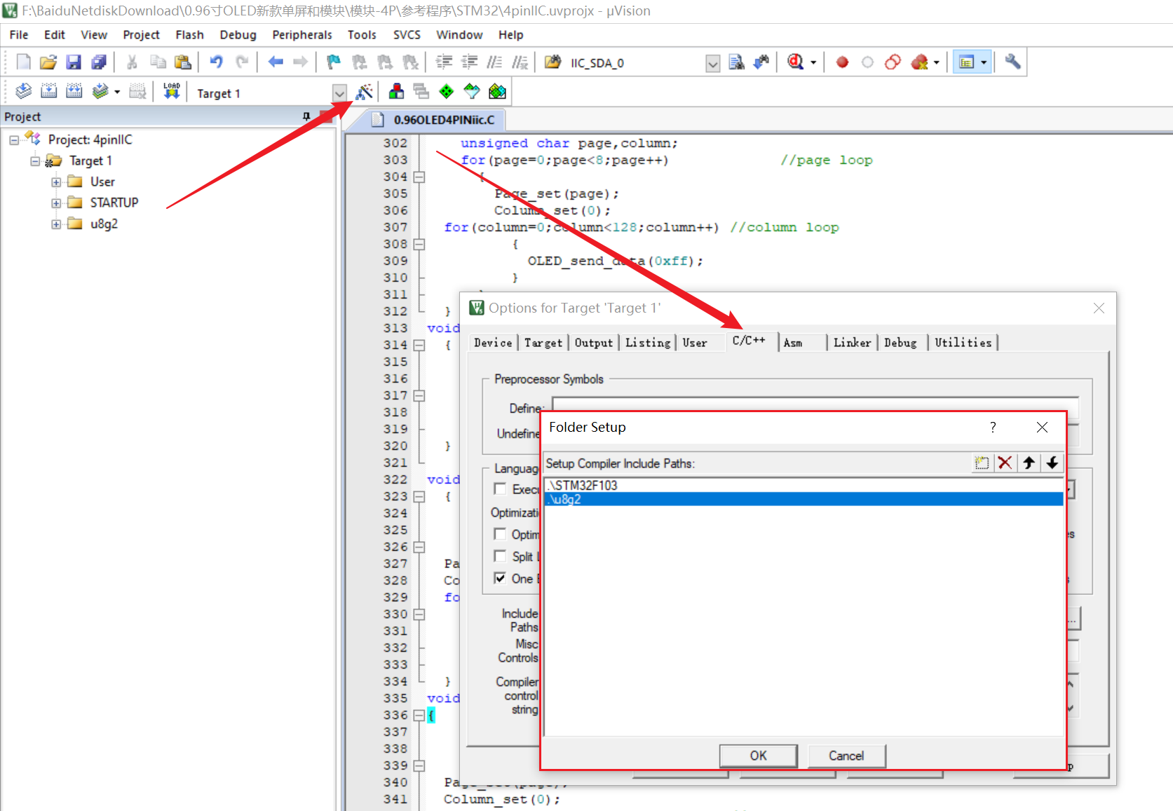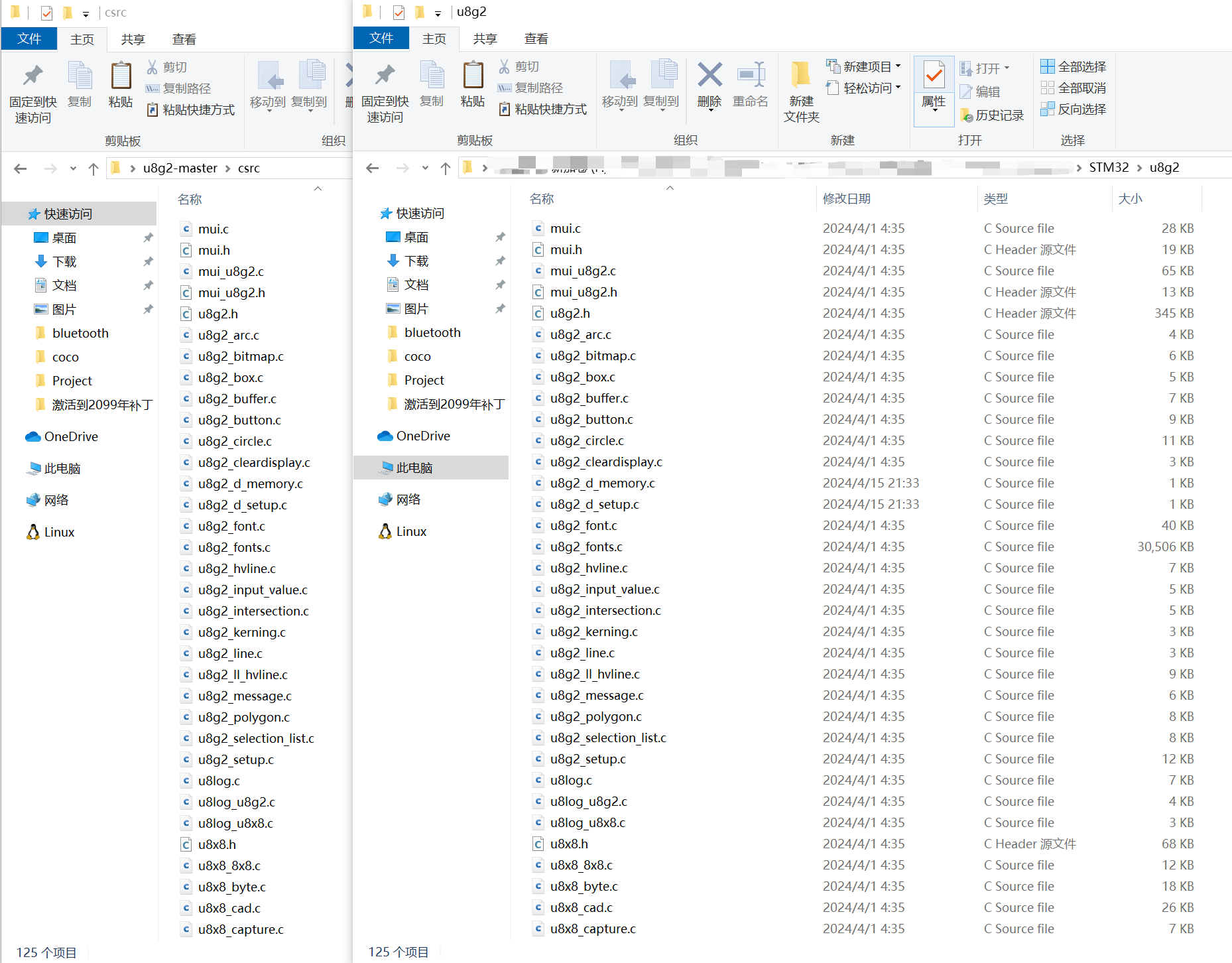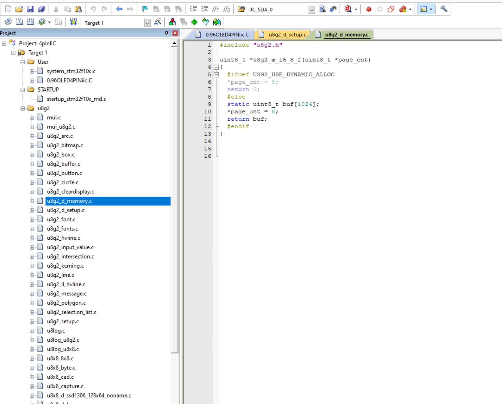 将U8g2 目录下的 csrc 复制到 STM32项目下,并重命名为u8g2 删除u8x8_d_ 开头的所有文件( 除了u8x8_d_ssd1306_128x64_noname.c )